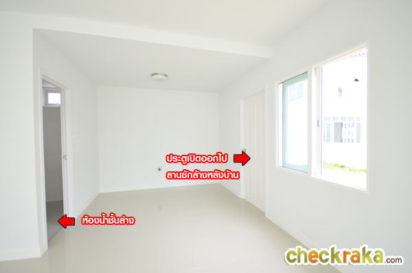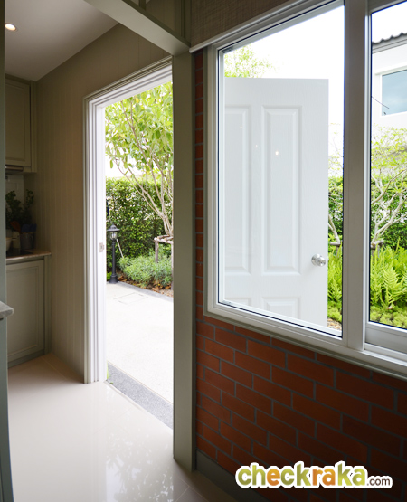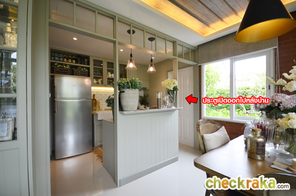ด้านหลังบ้านจะเป็นส่วนของครัว มีหน้าต่างบานเลื่อนระบายอากาศ และประตูเปิดออกไปลานซักล้างหลังบ้าน