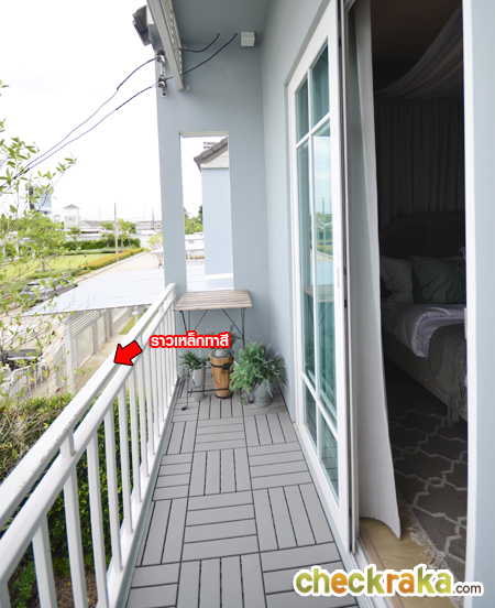 ระเบียงด้านนอกปูกระเบื้องให้ ราวเป็นเหล็กทาสีขาว