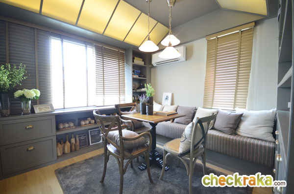 ส่วนรับประทานอาหารตรงนี้สามารถวางโต๊ะอาหารขนาด 4-6 ที่นั่งได้ มีกระจกทรงสูง (Sky Bay Window) อยู่ด้านข้างพอดี ทำให้พื้นที่ส่วนนี้มีความสว่าง ให้ความรู้สึกโปร่งโล่ง เปิดรับวิวภายนอกตัวบ้านโดยไม่ต้องเปิดไฟก็ได้