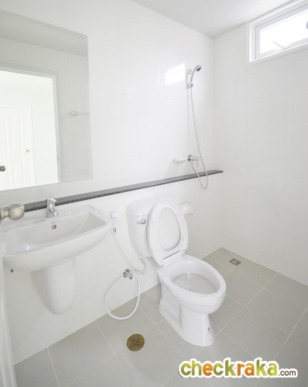 ภายในห้องน้ำมีสุขภัณฑ์ให้ครบ เป็นของ American Standard มีบานกระทุ้งระบายอากาศมาให้ด้วย