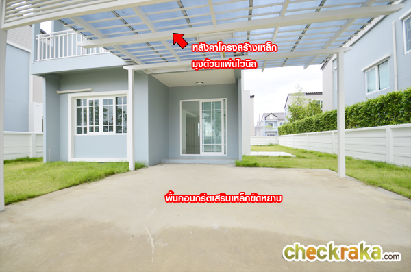 ที่จอดรถในร่มสามารถจอดได้ 2 คัน หลังคาโครงสร้างเหล็กมุงด้วยแผ่นไวนิล