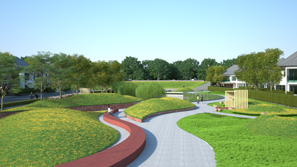 แสดงให้เห็นถึง ถนนภายในโครงการ บ้าน สวนสาธารณะ สะพาน และทางเข้า-ออก