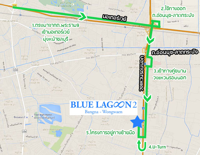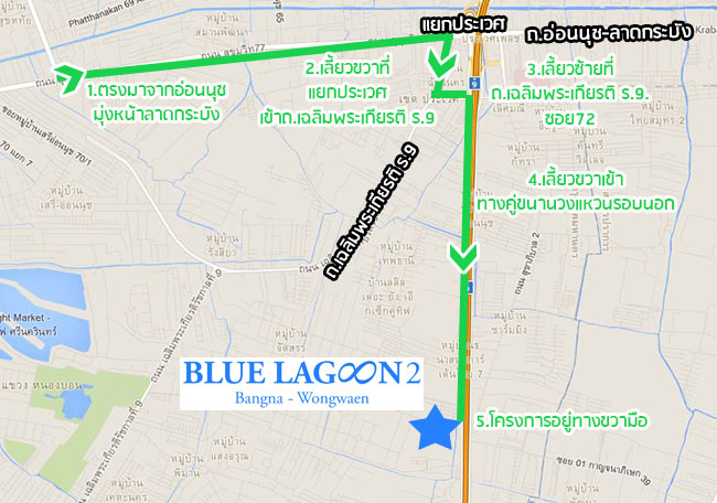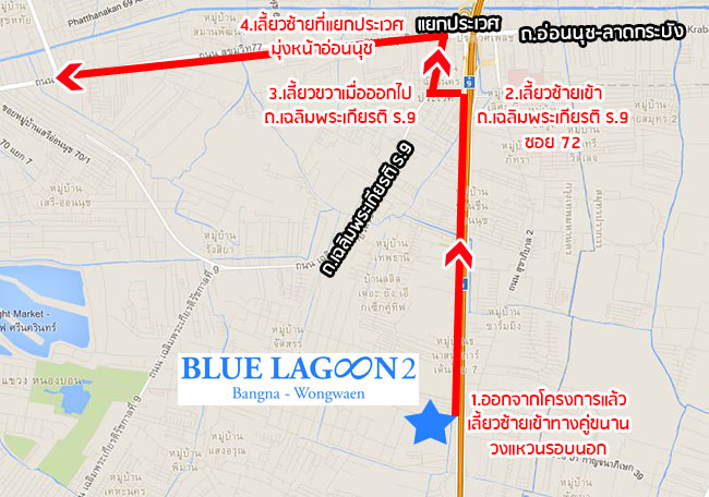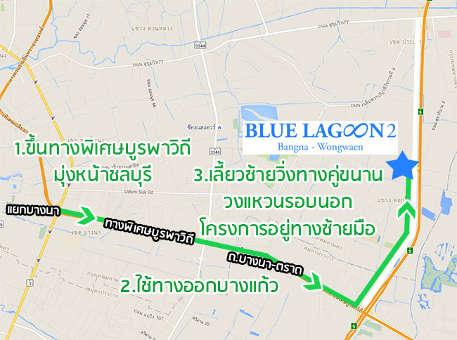 จากนั้นก็ตรงไปเรื่อยๆ เลยค่ะ พอเห็นป้ายของโครงการ บลูลากูน 2 ก็ให้ชิดซ้ายได้เลยค่ะ ใกล้ถึงแล้ว