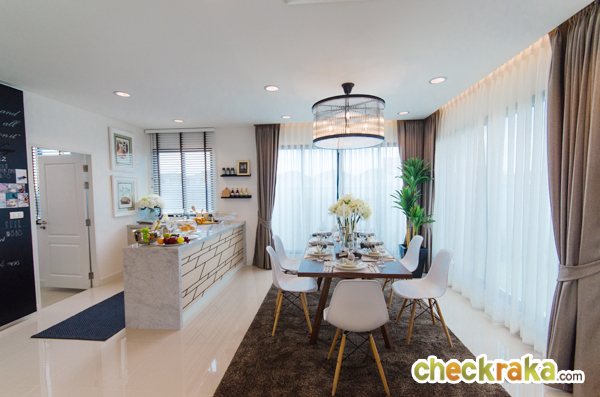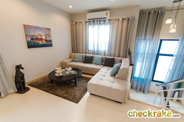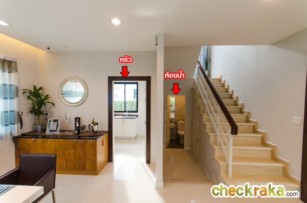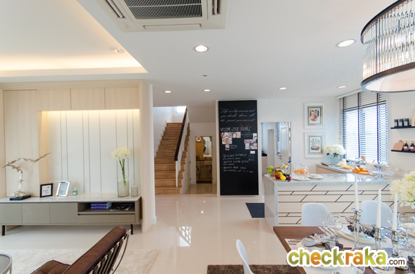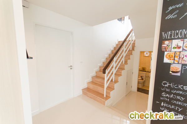 เป็นบ้านตัวอย่างที่ตกแต่งแล้วเหมือนกันค่ะ มีขนาดของพื้นที่ใช้สอยถึง 188 ตร.ม. ขนาดที่ดิน 51-62 ตร.ว. 3 ห้องนอน (3 ห้องนอนบน) 3 ห้องน้ำ (2 ห้องน้ำบน กับ 1 ห้องน้ำล่าง) 1 ห้องครัว มีพื้นที่รับแขกและรับประทานอาหาร และที่จอดรถ 2 คัน