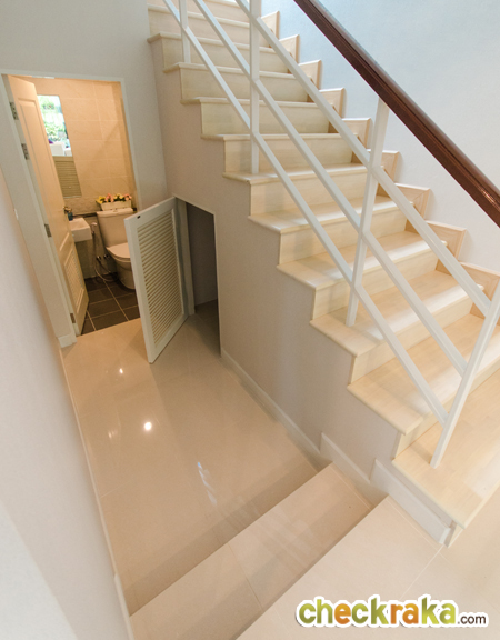 ห้องน้ำชั้นล่างของบ้านอยู่ข้างๆ บันไดนี่เองค่ะ ภายในห้องน้ำมีสุขภัณฑ์ให้ครบของ American Standard