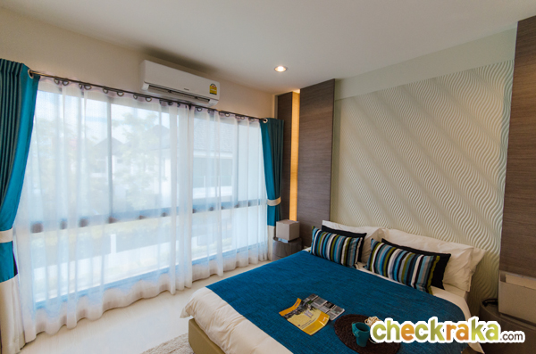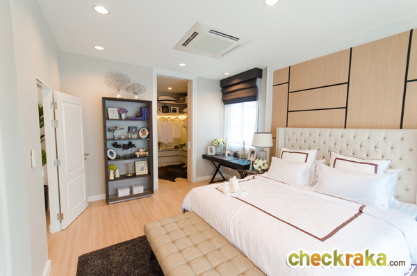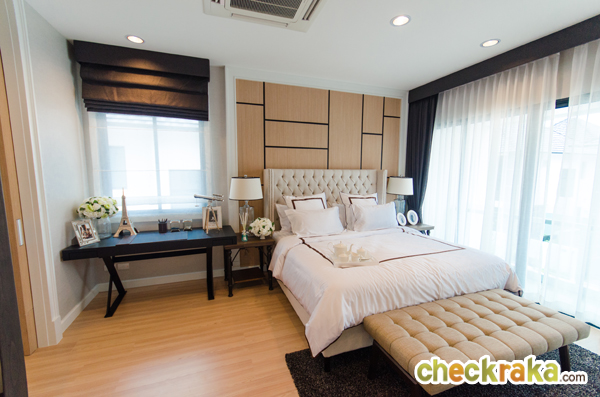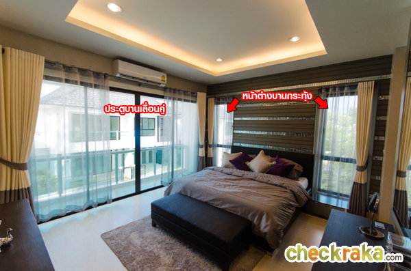หน้าต่างบานกระทุ้ง 2 บาน ห้องน้ำในตัว และ Walk-in Closet ประตูบานเลื่อนทั้งกว้างและสูงเกือบเต็มผนังด้านหน้าทำให้ห้องดูสว่างมาก ประกอบกับบานกระทุ้งข้างหัวเตียงทั้งสองด้านยิ่งเพิ่มความสว่างของห้อง