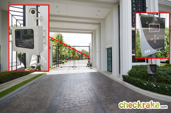 ที่ซุ้มประตูทางเข้ามีทั้ง รปภ., การ์ดสแกน, ไม้กั้นกระดก, CCTV (มีกล้อง 2 ตัว) และประตูบานเลื่อนอัตโนมัติ