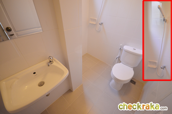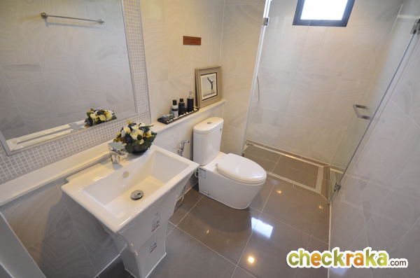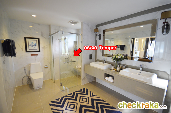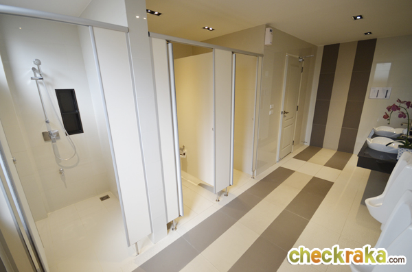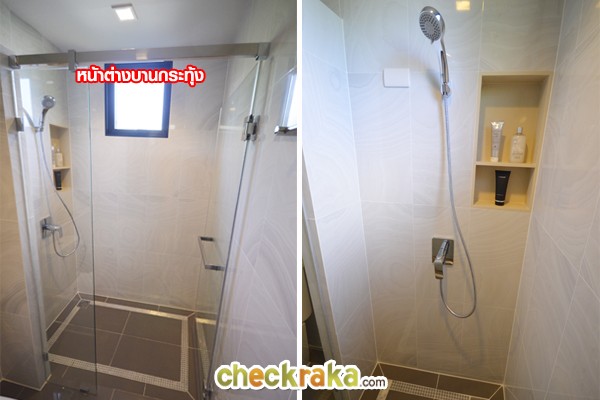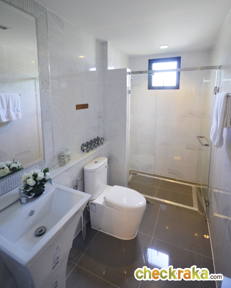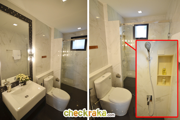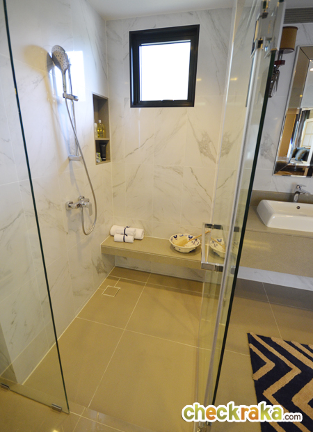ภายในห้องน้ำมีการแยกส่วนเปียก/แห้ง โดยฉากกั้นอาบน้ำกระจกนิรภัย ข้างๆ ฝักบัวเจาะช่องสำหรับวางของ