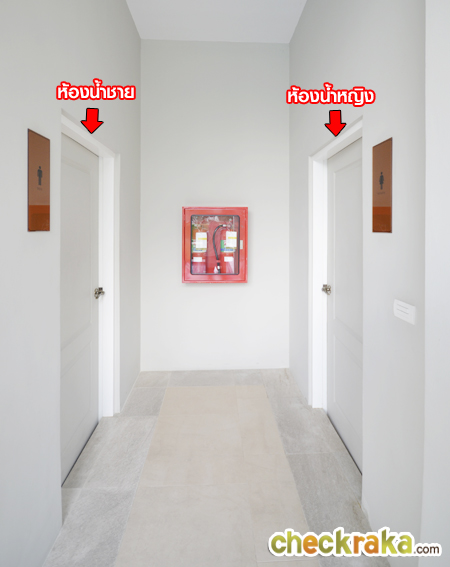 ออกมาด้านนอกฝั่งซ้ายจะเป็นทางเข้าห้องน้ำ ตรงไปจะเห็นบันไดทางเดินขึ้นชั้น 2 เพื่อไปฟิตเนส