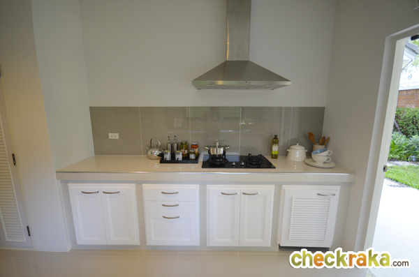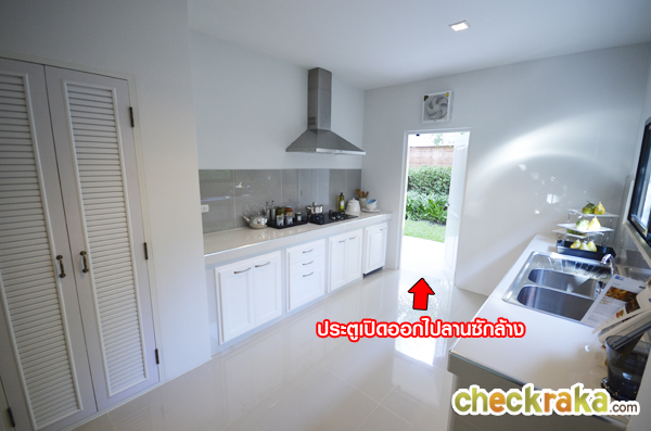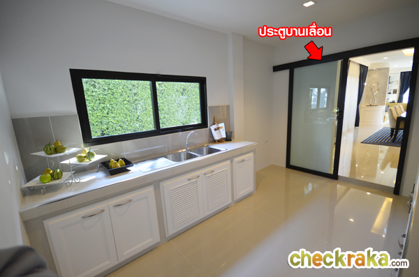 ประตูครัวเป็นบานเลื่อนเดี่ยว ช่วยเก็บกลิ่นที่จะเข้าไปในตัวบ้านได้ดีกว่าประตูปกติ ส่วนอีกด้านเป็นซิงค์ล้างจานแบบ 2 หลุม