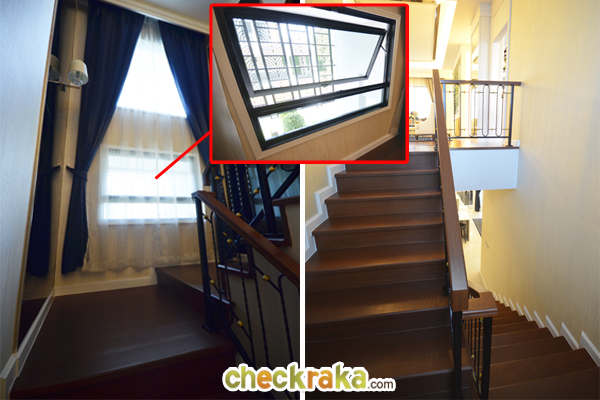 บันไดมีชานพักสี่เหลี่ยมขนาดใหญ่ เดินสะดวก และปลอดภัย มีกระจกรับแสงบานใหญ่ทำให้ตอนกลางวันแสงธรรมชาติ
