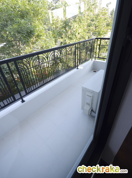 ระเบียงห้องกว้างพอสมควร มีราวกันตกสีดำ
