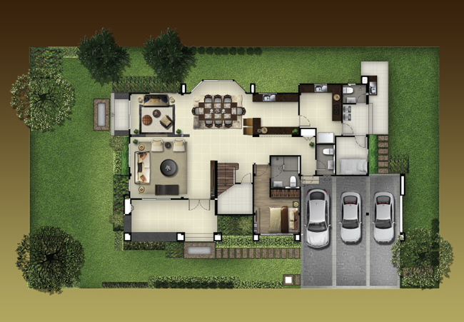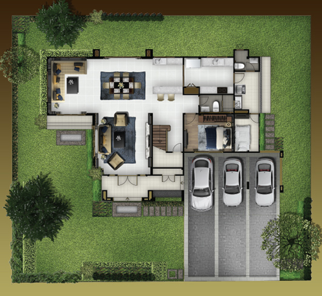 1. แบบบ้าน GRANDEUR - บ้านเดี่ยว 2 ชั้น ขนาดที่ดิน 132-211 ตร.ว. ขนาดพื้นที่ใช้สอย 414 ตร.ม. ขนาด 5 ห้องนอน 6 ห้องน้ำ 1 ห้องอเนกประสงค์ 1 ห้องนั่งเล่น 1 ห้องพระ 1 ห้องคนรับใช้ ที่จอดรถ 3 คัน