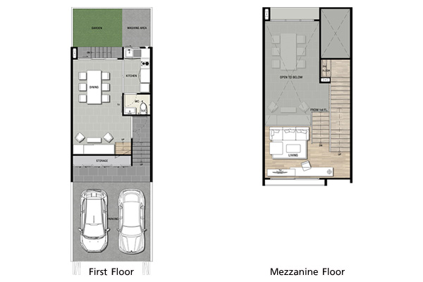แปลนบ้านชั้น 1 และ ชั้นลอย หน้าบ้านจอดรถได้สองคัน