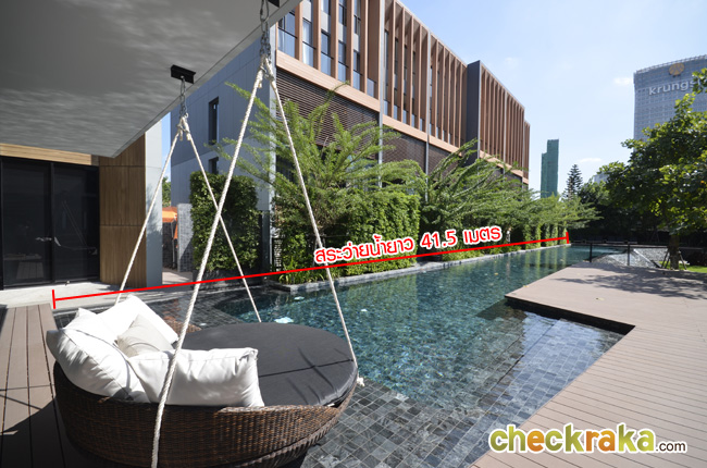 สระว่ายน้ำมีที่นั่งพักผ่อนหย่อนใจ และฟิตเนสอยู่ด้านบน