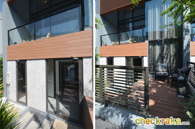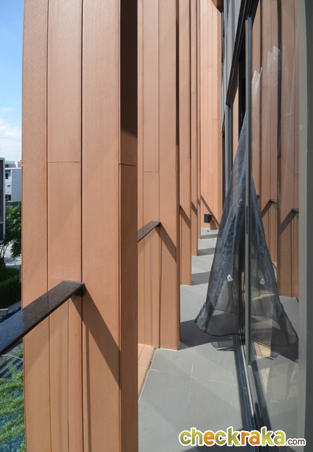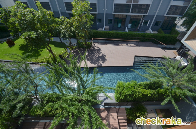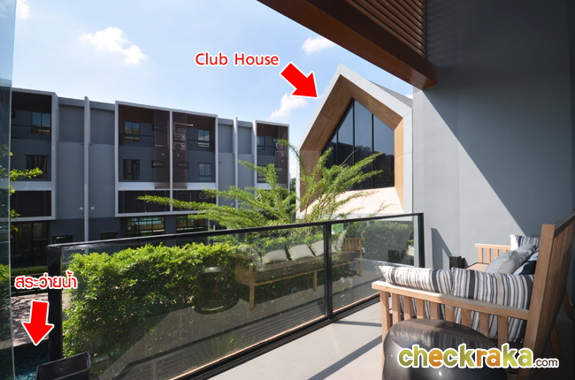 ลองเดินออกมาบริเวณระเบียงที่อยู่ด้านหลังพื้นที่ห้องนั่งเล่น มองเห็นวิวสระว่ายน้ำ และคลับเฮ้าส์
