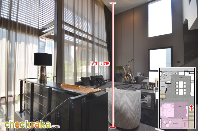 โดยความสูงจากพื้นถึงฝ้าของชั้นนี้ บริเวณพื้นที่ห้องนั่งเล่น จะสูงถึง 5.4 เมตรเลยทีเดียวค่ะ