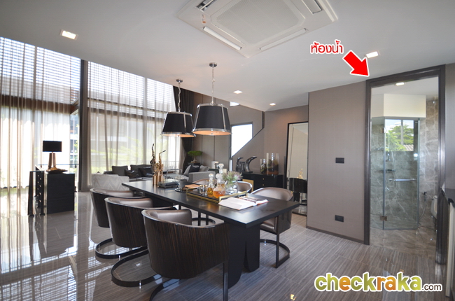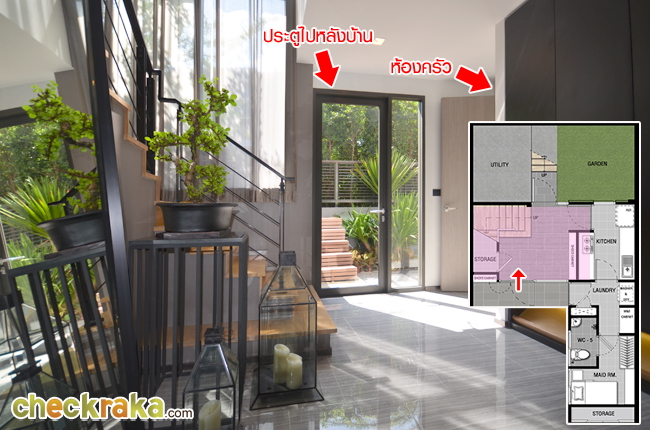 ด้านหลังไปหลังบ้าน ด้านขวาไปห้องครัว และห้องแม่บ้าน ด้านซ้ายเป็นบันได