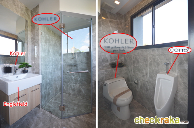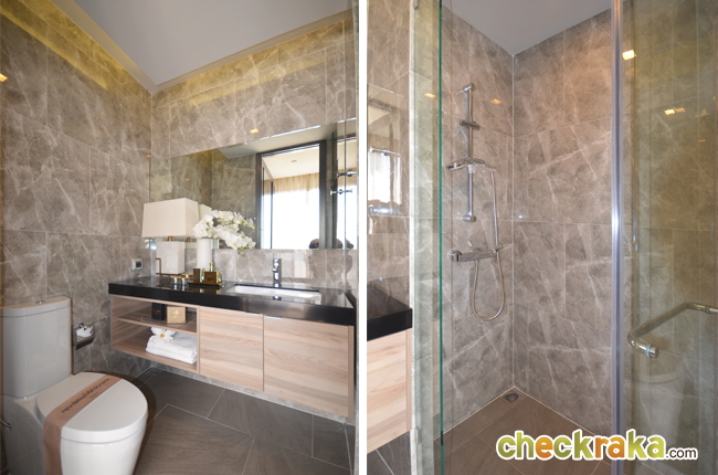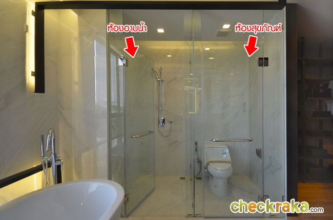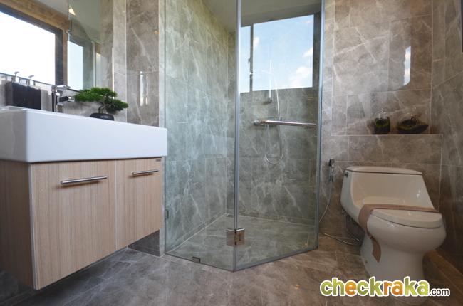 ภายในห้องน้ำ มีทั้งสุขภัณฑ์และ Shower โดยกั้นเป็นห้องกระจกแยกส่วนให้