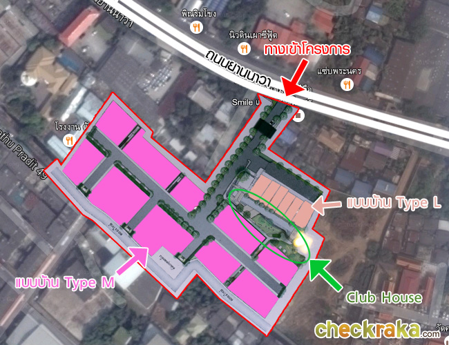 - ตัวโครงการโดยรวมและส่วนกลาง - ตัวโครงการอยู่ติดกับถนนยานนาวา ทางเข้าโครงการลึกจากถนนเข้าไปประมาณ 30 เมตร โดยทำเป็นซุ้มประตูสูง 10 เมตร ซึ่งเป็นเอกลักษณ์ของโครงการ ทางเข้ามีจุดรับแลกบัตรสำหรับผู้มาเยือน ส่วนลูกบ้านสามารถใช้ระบบ Smart Access ผ่านได้เลย ซึ่งมีกล้องวงจรปิดอยู่ด้วย และยังมีกล้องวงจรปิดอยู่รอบโครงการอีกประมาณ 16 จุด ถนนด้านในโครงการล้อมไปด้วยต้นไม้สูง และมีประดับอยู่รอบโครงการ โครงการมีทั้งหมด 68 ยูนิต แบบบ้าน 2 Type คือ Type M และ Type L โดย Type L จะอยู่ด้านหน้าโครงการมีทั้งหมด 6 ยูนิต ด้านหลังบ้าน Type L จะเป็น Clubhouse มีฟิตเนส สระว่ายน้ำระบบเกลือที่มีความยาวของสระถึง 41 เมตร พร้อมจากุชซี่ และสนามเด็กเล่น ถัดจาก Club House ด้านในจะเป็นพื้นที่ของแบบบ้าน Type M ทั้งหมด