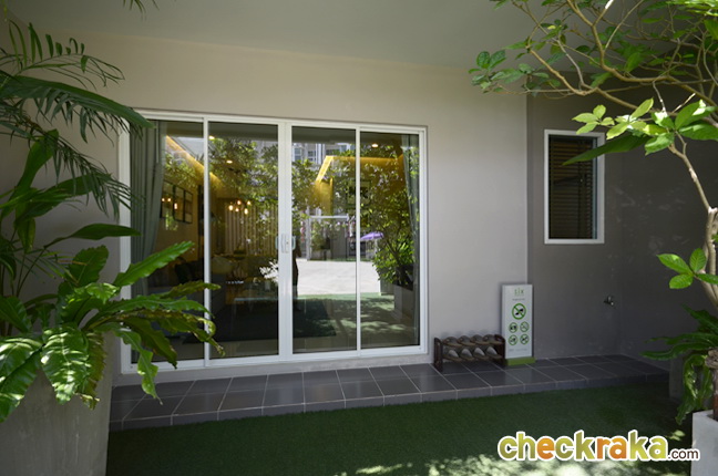 ทางเข้าหน้าบ้าน โครงการตกแต่งด้วยบรรดาต้นไม้และปูพื้นหญ้าปลอม