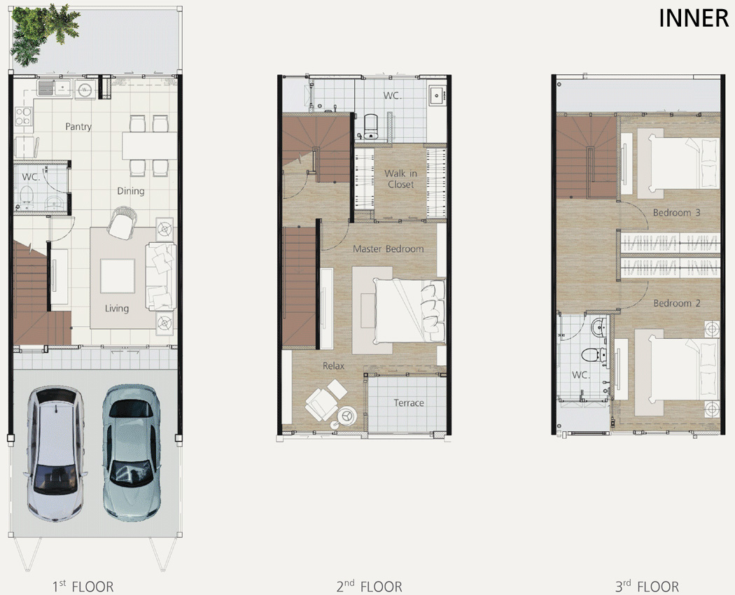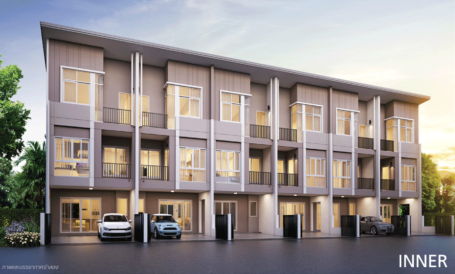 1. แบบบ้าน INNER ทาวน์โฮม 3 ชั้น หน้ากว้าง 5 เมตร ขนาดที่ดินเริ่มต้น 20 ตร.ว. พื้นที่ใช้สอยเริ่มต้น 150 ตร.ม. ประกอบไปด้วย 3 ห้องนอน 3 ห้องน้ำ 1 ห้องแต่งตัว 1 ห้องรับแขก 1 ส่วนรับประทานอาหาร 1 ห้องครัว 1 ระเบียงพักผ่อน และ 2 ที่จอดรถ