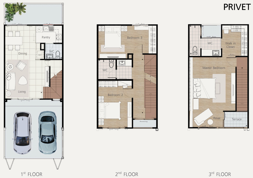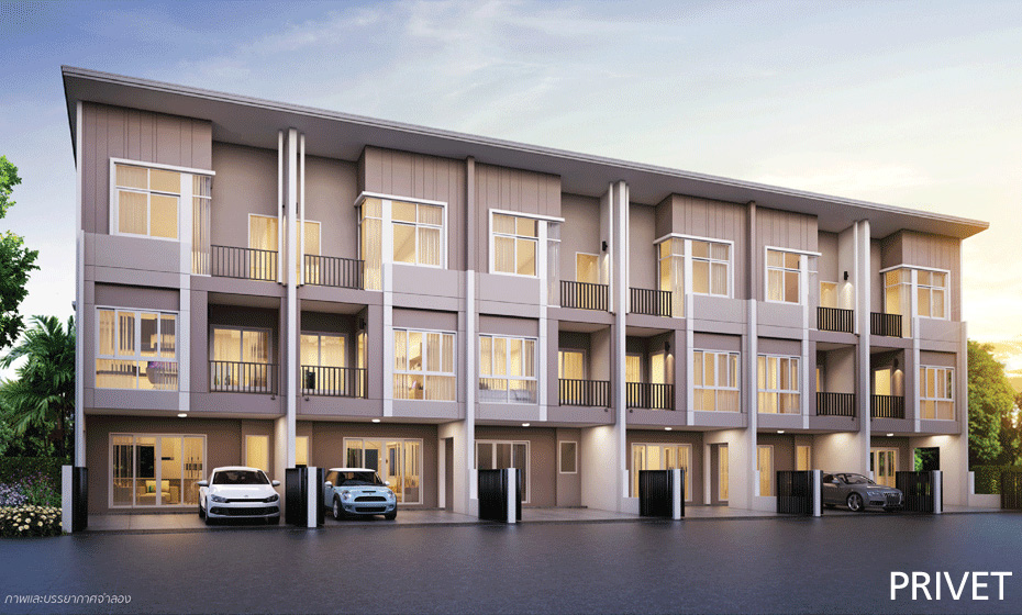 2. แบบบ้าน PRIVET ทาวน์โฮม 3 ชั้น หน้ากว้าง 5.5 เมตร ขนาดที่ดินเริ่มต้น 20 ตร.ว. พื้นที่ใช้สอยเริ่มต้น 186 ตร.ม. ประกอบไปด้วย 3 ห้องนอน 3 ห้องน้ำ 1 ห้องแต่งตัว 1 ห้องรับแขก 1 ส่วนรับประทานอาหาร 1 ห้องครัว 1 ระเบียงพักผ่อน และ 2 ที่จอดรถ