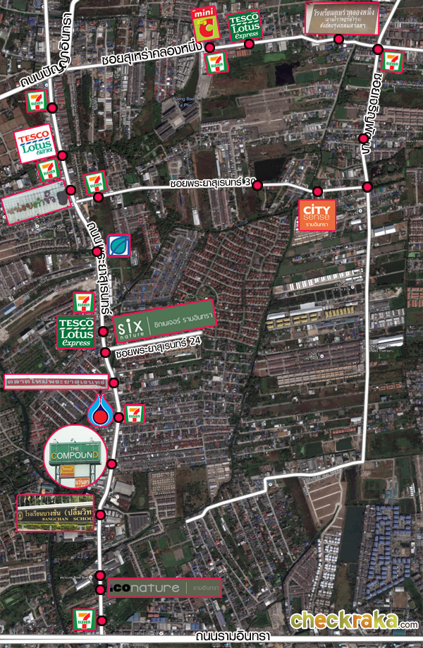 โครงการตั้งอยู่ในซอยรามอินทรา 109 (ถนนพระยาสุเรนทร์) ที่มีความคึกคักอยู่ทีเดียวค่ะ โดยตลอดทั้งถนนนี้มีสิ่งอำนวยความสะดวกอยู่มากมาย ทั้งเซเว่นอีเลฟเว่นที่มีนับไม่ถ้วน ร้านค้า ร้านอาหาร และเทสโก้ โลตัส เอ็กซ์เพรส สามารถจับจ่ายใช้สอยเครื่องอุปโภค บริโภคได้อย่างสะดวกสบาย นอกจากนี้ยังมีคอมมิวนิตี้มอลล์อย่าง The Compound อีกด้วยค่ะ โดยซอยที่อยู่ใกล้กันคือซอยเจริญพัฒนา เชื่อมต่อกับถนนสุเหร่าคลองหนึ่งนั้นก็มีความคึกคักไม่แพ้กัน มีทั้งเทสโก้ โลตัส เอ็กซ์เพรส, บิ๊กซี มินิ, และเซเว่น อีเลฟเว่น สามารถดูรายละเอียดสภาพแวดล้อมใกล้เคียงได้จากแผนที่ด้านล่าง คลิกที่จุดและสถานที่ เพื่อดูภาพใหญ่ได้ค่ะ