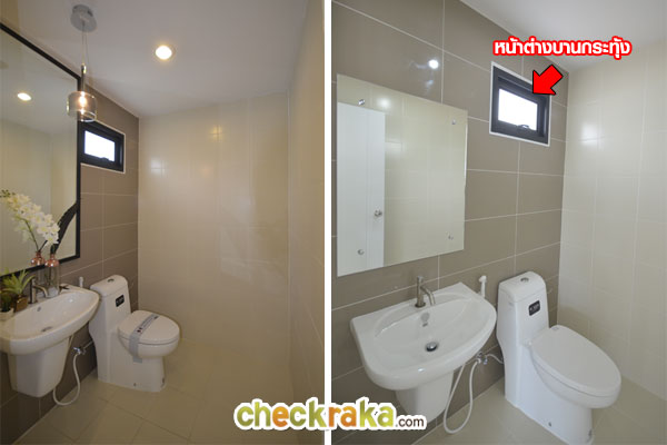 ห้องน้ำของบ้านเปล่าจะให้กระจกตรงอ่างล้างมือขนาดนี้นะคะ ไม่ได้บานใหญ่เหมือนบ้านตัวอย่าง ส่วนบานกระทุ้ง