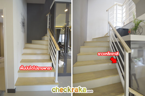 มีชานพักให้ 2 จุด แบบสามเหลี่ยม พื้นบันไดไม้ยางพารา มีราวจับ 1 ด้าน