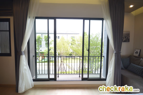 ระเบียงส่วนตัว เปิด-ปิดด้วยประตูบานเลื่อนคู่ ตัวประตูขนาดใหญ่ทำให้แสงธรรมชาติเข้ามาในห้องได้ค่อนข้างดี