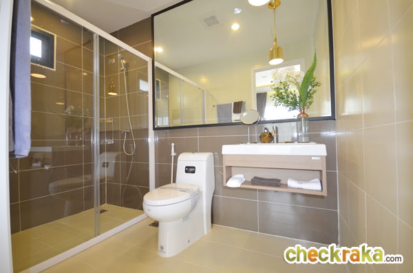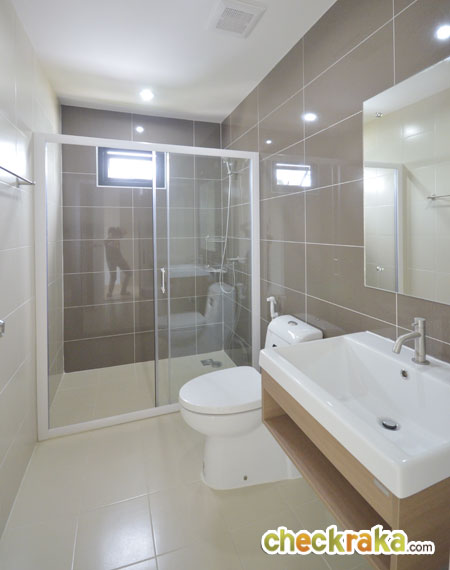 และฝักบัว นอกจากนี้ยังแยกส่วนเปียก/แห้ง ให้อย่างชัดเจนด้วยกระจกกั้นบานเลื่อน และติดพัดลมดูดอากาศมาให้เลย