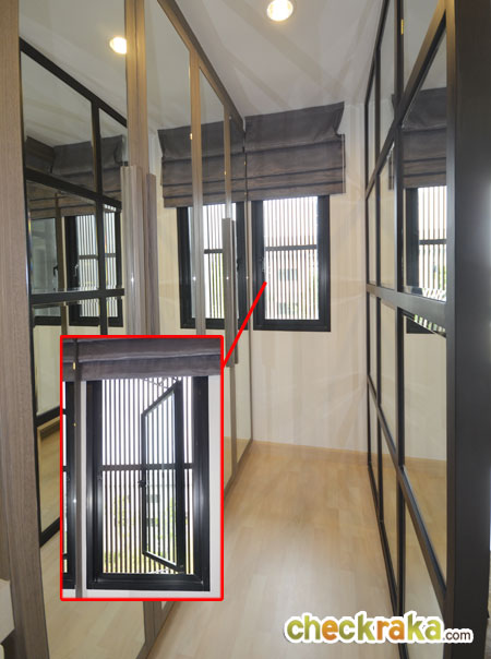 ส่วนที่จัดวาง Walk in closet มองตรงไปจะมีหน้าต่างบานกระทุ้ง เปิดออกไปได้ ข้างนอกมีพื้นที่สำหรับวาง