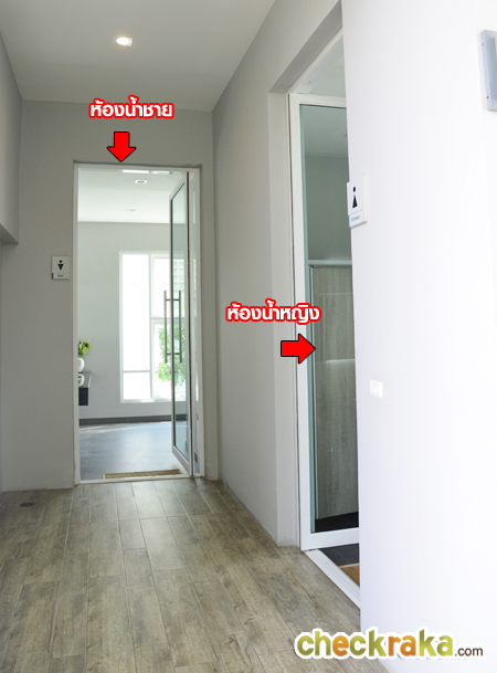 ถัดจากห้องฟิตเนสเป็นทางเข้าห้องน้ำ แยกห้องน้ำหญิง/ห้องน้ำชาย