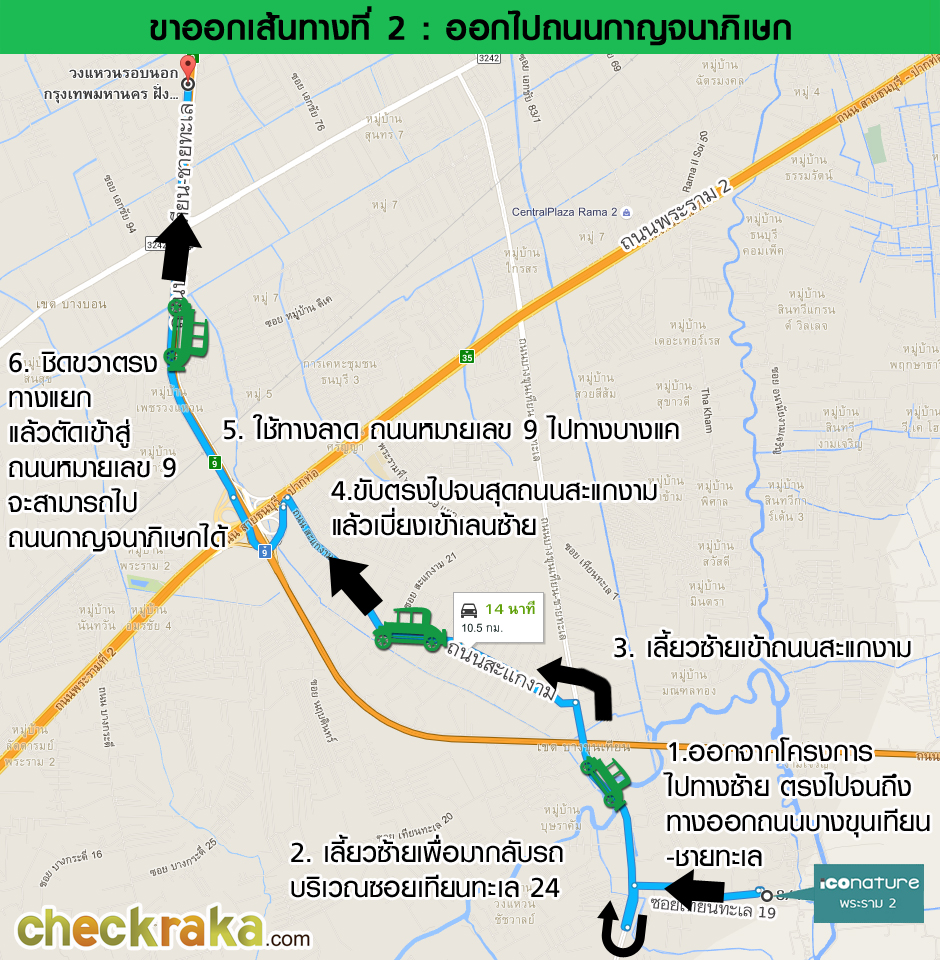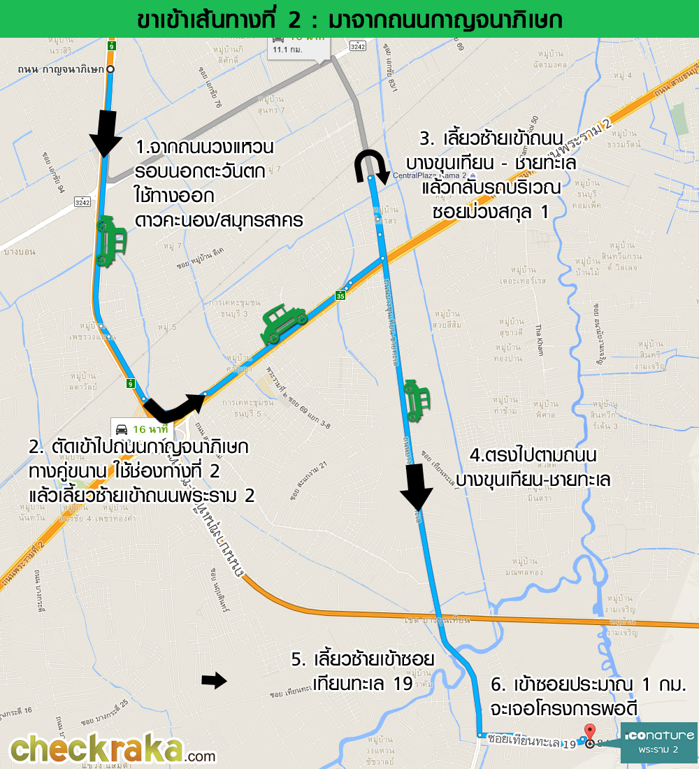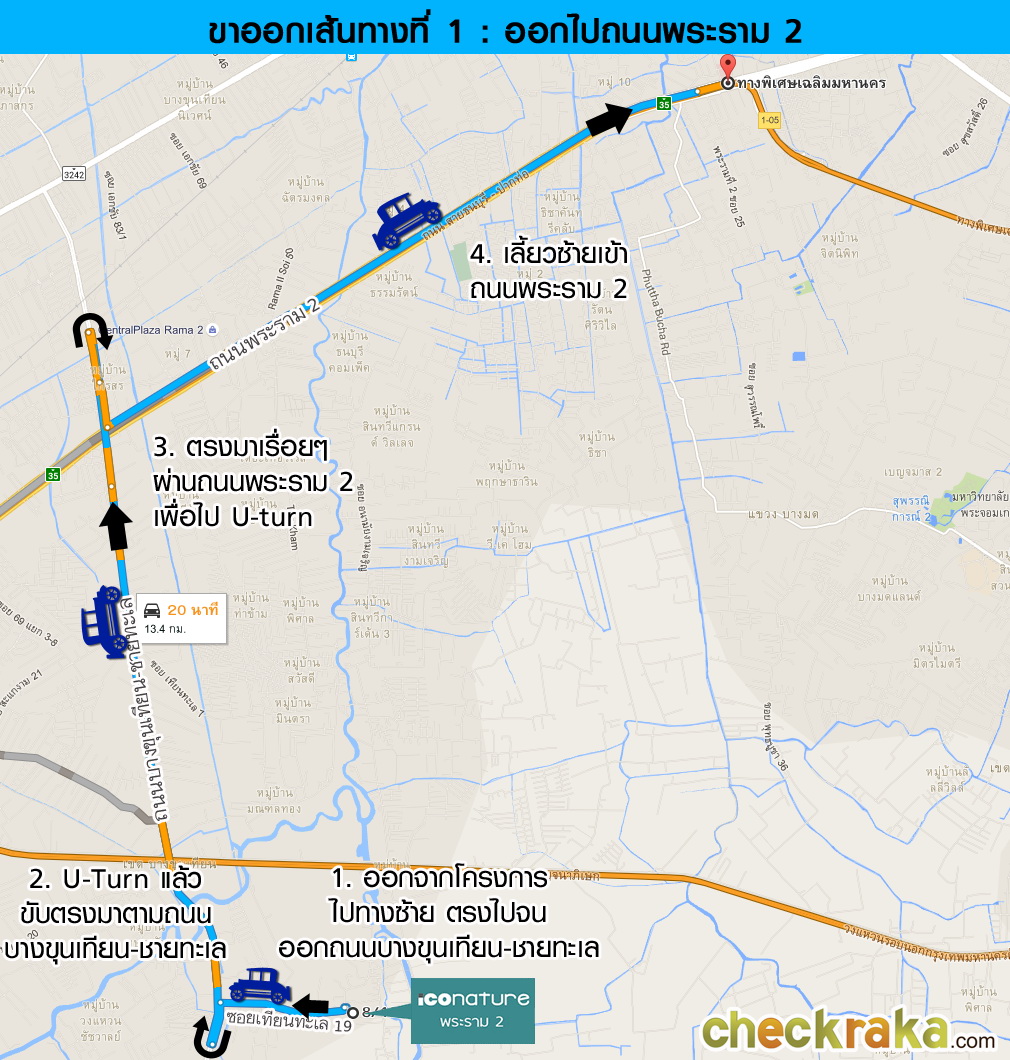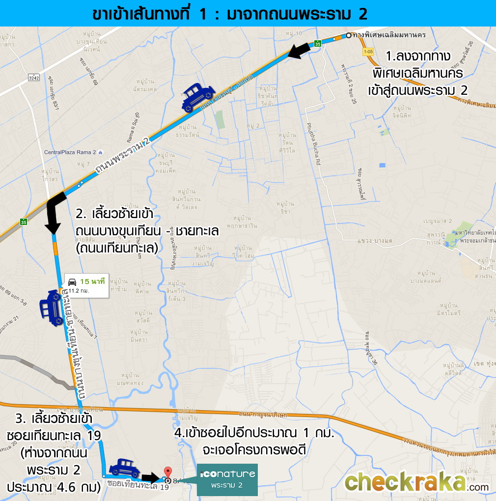 ขับตรงมาตามถนนพระราม 2 เรื่อยๆ จะผ่าน เซ็นทรัล พระราม 2 ด้านขวามือ และบิ๊กซีด้านซ้ายมือ