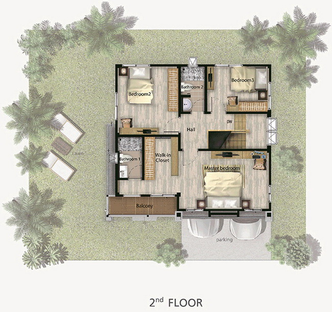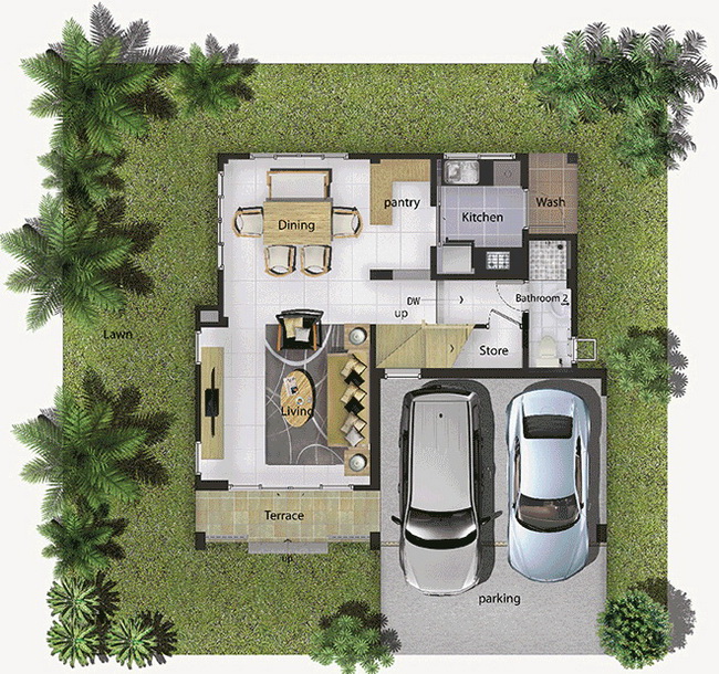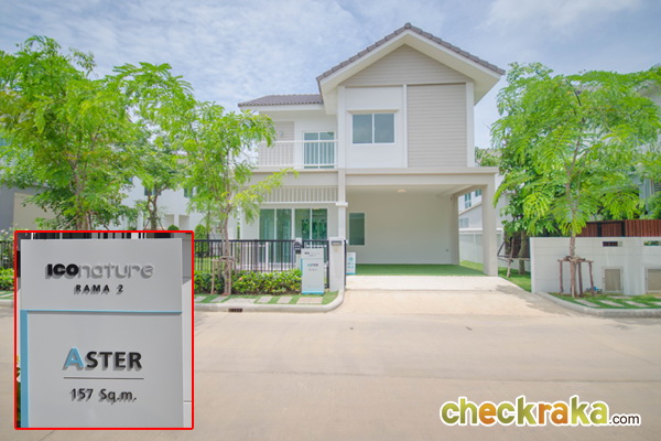 2. แบบบ้าน Aster - บ้านเดี่ยว 2 ชั้น ขนาดที่ดินเริ่มต้น 50 ตร.ว. พื้นที่ใช้สอย 157 ตร.ม. ประกอบไปด้วย 3 ห้องนอน 2 ห้องน้ำ 1 ส่วนพักผ่อน 1 ส่วนรับแขก 1 ส่วนรับประทานอาหาร 1 ส่วนจัดเตรียมอาหาร (Pantry) 1 ห้องครัว และ 2 ที่จอดรถในร่ม
