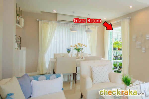 ด้านหลังเป็นโต๊ะรับประทานอาหาร ฝั่งซ้ายติดกับประตูทางออกไปด้านข้างบ้าน ส่วนฝั่งขวาจะเป็นห้องครัว