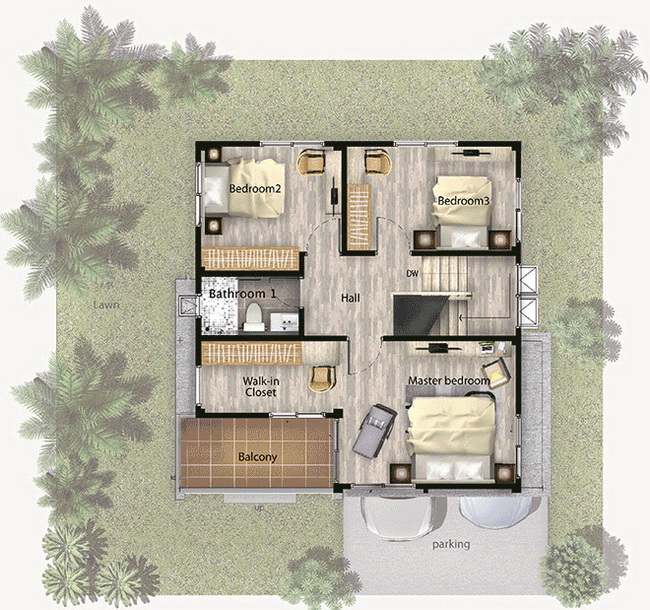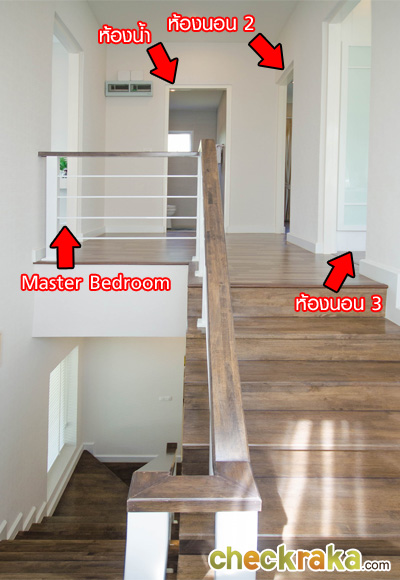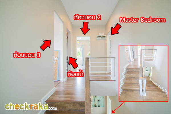 ส่วนด้านบน แบ่งออกเป็น 3 ห้องนอน 2 ห้องน้ำ (ห้องน้ำในตัว 1 ห้อง) เช่นกัน