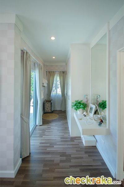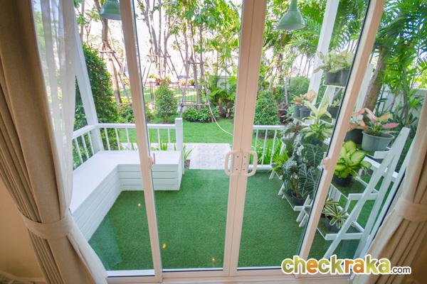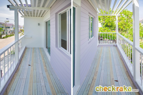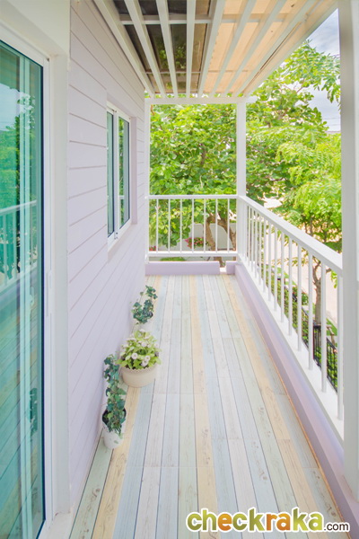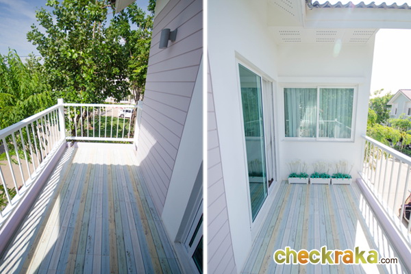 ระเบียงในห้องนอน ปูด้วยพื้นกระเบื้องลายไม้ให้เหมือนบ้านตัวอย่างเลยค่ะ