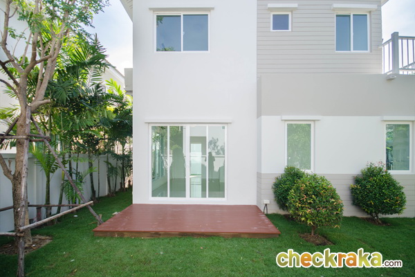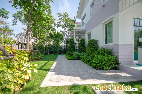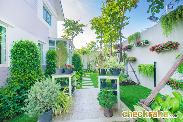 - แบบบ้านและวัสดุ - ในเฟสแรกและเฟสที่สองของโครงการนั้น ก่อสร้างด้วยการก่ออิฐมวลเบา ฉาบปูน หรือ ผนังคอนกรีตเสริมเหล็กหล่อในที่ แต่สำหรับเฟสใหม่ หรือเฟสที่สามเป็นต้นไป จะเป็นการก่อสร้างแบบ Pre-cast โครงการมีแบบบ้านทั้งหมด 2 แบบ คือ แบบบ้าน Peony และ แบบบ้าน Aster สำหรับแบบบ้าน Peony เนื้อที่บ้านเริ่มต้น 55 ตร.ว. พื้นที่ใช้สอย 165 ตร.ม. ประกอบไปด้วย 3 ห้องนอน 3 ห้องน้ำ 2 ที่จอดรถ และแบบบ้าน Aster เนื้อที่บ้านเริ่มต้นที่ 50 ตร.ม. พื้นที่ใช้สอย 157 ตร.ม. ประกอบไปด้วย 3 ห้องนอน 2 ห้องน้ำ 2 ที่จอดรถ ในส่วนของวัสดุอื่นๆ จะเหมือนกัน อาทิ พื้นลาดจอดรถเป็น พื้นซีเมนต์ปาดเรียบ พื้นลานซักล้างเป็นพื้นซีเมนต์ขัดหยาบ สำหรับภายในตัวบ้าน ประตูทางเข้าบ้านเป็นบานเลื่อนวงกบอลูมิเนียม Powder Coat สีขาวพร้อมกระจกเขียวตัดแสงหนา 5 มม. ประตูอื่นๆ ภายในบ้านเป็น บานประตูสำเร็จรูแ HDF พื้นบ้านชั้นล่างใช้ แกรนิตโต้ 60x60 cm. พื้นบ้านชั้นบนเป็นไม้ลามิเนต พื้นห้องน้ำเป็นกระเบื้องเซรามิค สุขภัณฑ์ใช้ของ Mogen หรือเทียบเท่า