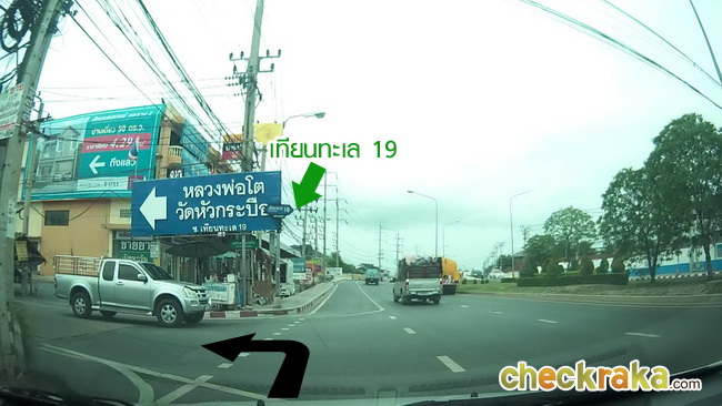 จากสะพานตรงมาอีกประมาณ 1.2 กม. จะเจอซอยเทียนทะเล 19 ให้เลี้ยวซ้ายเข้าไปได้เลย