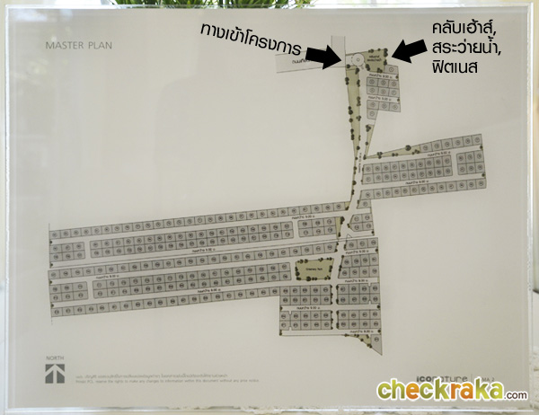 Master Plan ของโครงการ แสดงให้เห็นส่วนที่เป็นทางเข้า สาธารณูปโภคส่วนกลาง และบ้านทั้งหมดของโครงการ