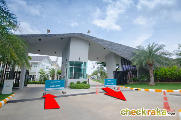 อ้อมวงเวียนมา จะเจอกับทางเข้าโครงการ เป็นประตูเลื่อนโครงเหล็ก