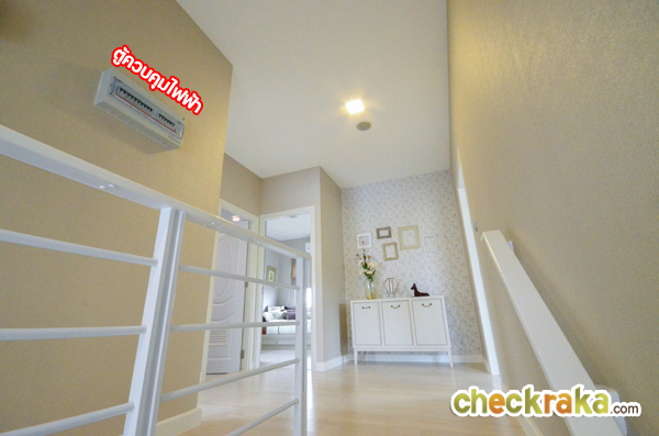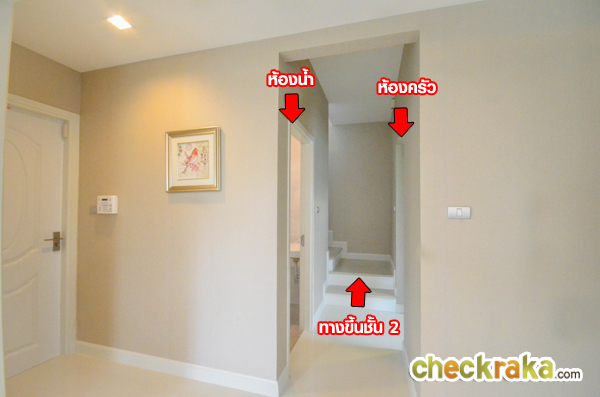 ขึ้นบันไดมาที่ชั้น 2 มองตรงไปจะเห็นผนังตรงที่มีตู้วางอยู่ ตรงนั้นสามารถบิวท์อินเป็นหิ้งพระ หรือชั้นวางของเก๋ๆ