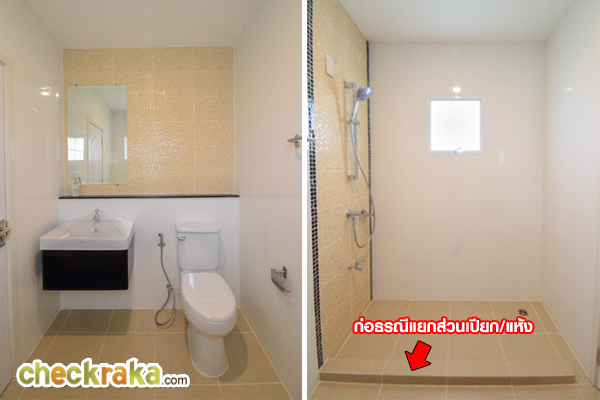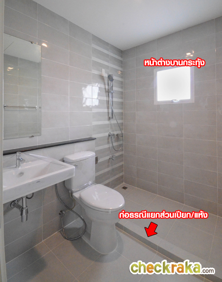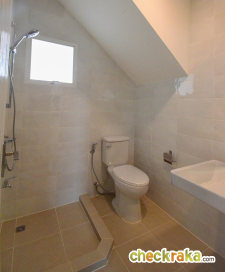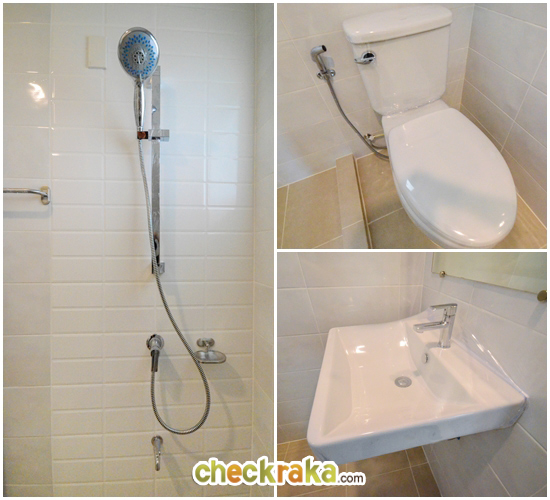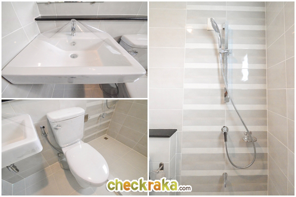มีสุขภัณฑ์ให้ครบ ทั้งอ่างล้างมือ โถสุขภัณฑ์ ฝักบัว และมีบานกระทุ้งระบายอากาศให้ 1 บาน