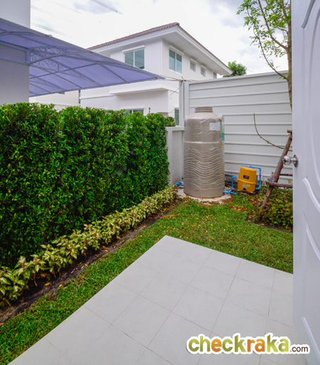 ด้านหลังบ้านสามารถเดินทะลุไปรอบๆ บ้านได้ บ้านที่นี่จะติดตั้งแทงค์น้ำ และปั๊มน้ำมาให้ครบ