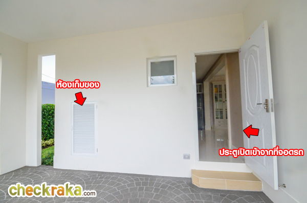 เฉลียงด้านหน้าบ้านปูกระเบื้องมาให้ พื้นที่ด้านข้างประตูมีความกว้างพอสมควรสามารถวางตู้รองเท้าทรงสูงได้