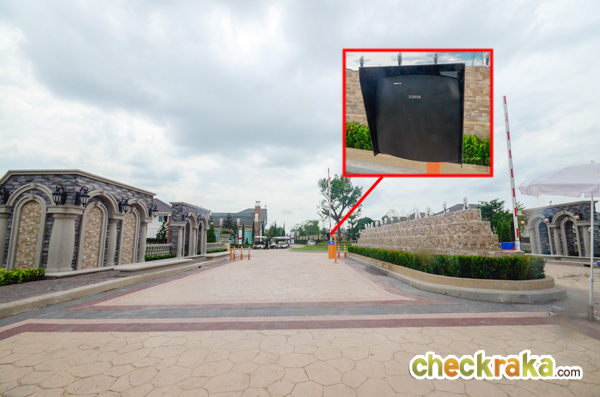 ที่ซุ้มประตูทางเข้ามีทั้ง รปภ. การ์ดสแกน, ไม้กั้นกระดก และ CCTV ฝั่งซ้ายมือมีทางเดินสำหรับคนเดินเข้าให้ด้วย
