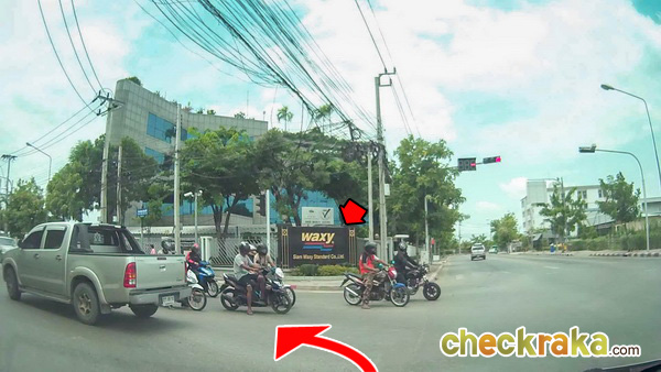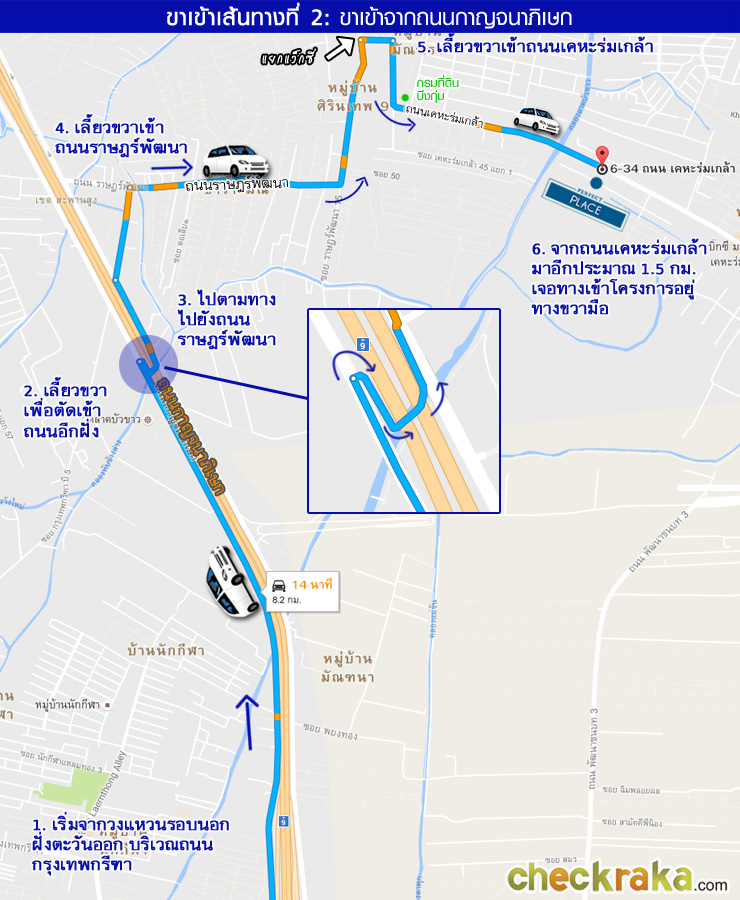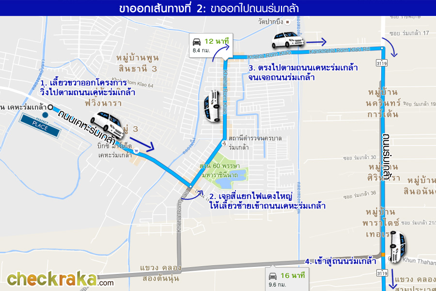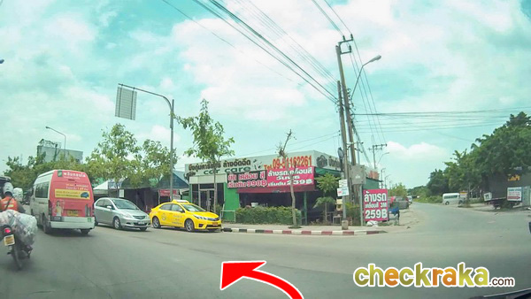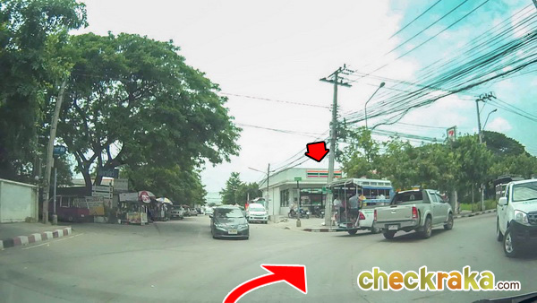 อีก 150 ม. เลี้ยวขวาเข้าถนนเคหะร่มเกล้า จุดสังเกตคือ ตรงหัวมุมทางแยกจะมีเซเว่น-อีเลฟเว่น