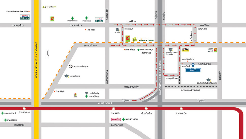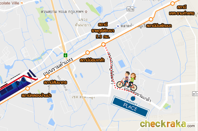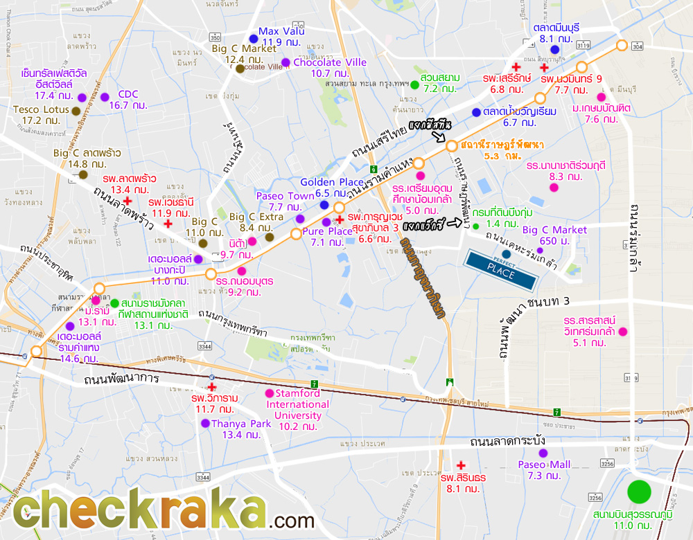 แผนที่แสดงระยะทางจากโครงการมายังรถไฟฟ้าสายสีส้ม สถานีราษฎร์พัฒนา